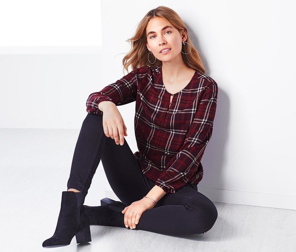 Блузка з м'яким потоком Lenzing Viscose®-Web має круглий виріз з V-подібним вирізом, облицювальним елементом і декоративним закривальним елементом і кишеньковим патч-кишенею. Поділ і манжети на гумці.