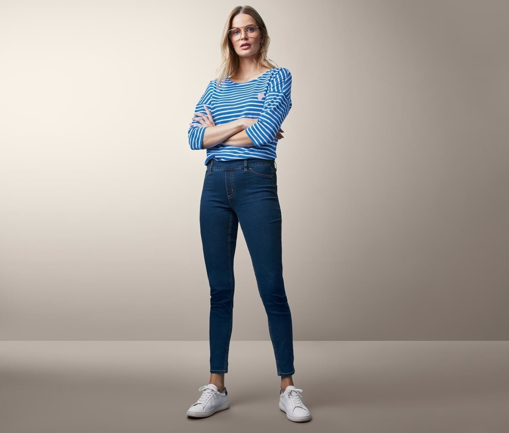 Приємно м'яка суміш бавовняної еластичної якості. З органічної бавовни. Еластичний пояс з петлями для пояса. Синій денім. Приталений. Накладні кишені ззаду. Шви контрастного кольору для класичного стилю джинсів. З еластаном: стабільна за розмірами, ідеальна посадка, високий комфорт при носінні. Тонкі жіночі джинси як основа для багатьох нарядів.