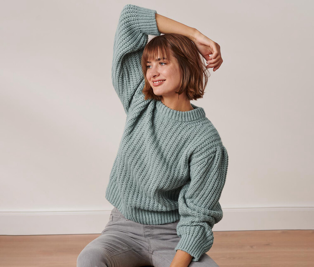 Широкий в'язаний светр з вовною, димчатий синій. З вовною RWS. Злегка вирізані плечі з тонкими зборками. Еластичні манжети в рубчик по горловині, манжетам і подолу. Круглий виріз. 16% вовна RWS, сертифікована CU 809415. Перевірено на вміст шкідливих речовин – сторонніми акредитованими інститутами.